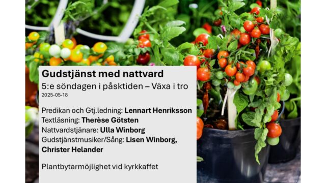 5:e söndagen i påsktiden. Att växa i tro. Predikan: Lennart Henriksson. Musik: Lisen Winborg, Christer Helander. Omsorgsgrupp D. Söndagens evangelietext: Johannesevangeliet 15:10–17 I samband med kyrkkaffet finns en plantbytarmöjlighet. Ta med plantor du vill byta med.