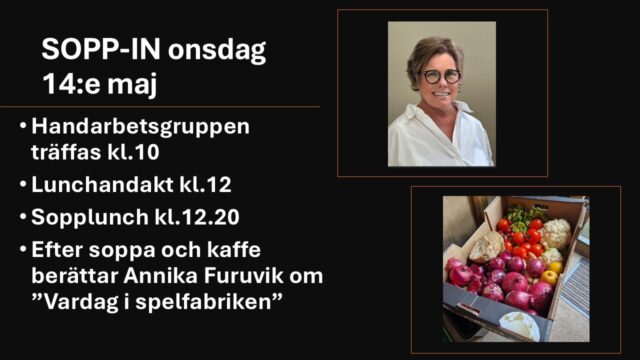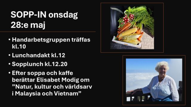 Sopplunch. Varje onsdag från kl. 12.20 serveras soppa med smörgås samt kaffe och kaka till ett pris av 50:-. Efter maten möjlighet till fortsatt gemenskap. I anslutning till lunchen erbjuds olika program, som musik och olika föreläsningar - olika från gång till gång. Från klockan 10 finns dessutom möjlighet att delta...