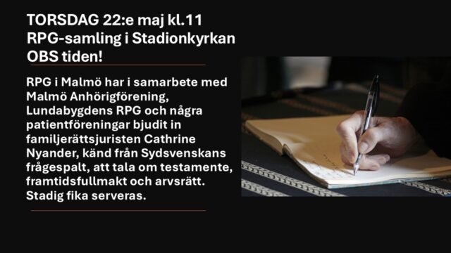 RPG i Malmö har i samarbete med Malmö Anhörigförening, Lundabygdens RPG och några patientföreningar bjudit in familjerättsjuristen Catherine Nyander, känd från Sydsvenskans frågespalt, att tala om testamentet, framtidsfullmakt och arvsrätt. Stadig fika serveras. Välkommen.